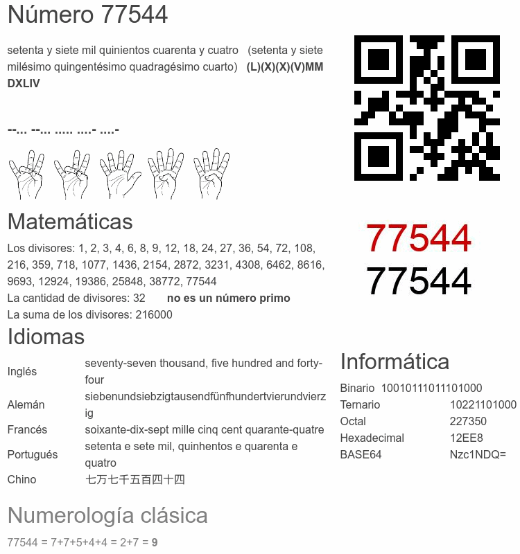 Si conoce algo interesante sobre el número 77544 o cualquier número natural (entero positivo), por favor escríbanos.Número 77 544 en otras unidades
