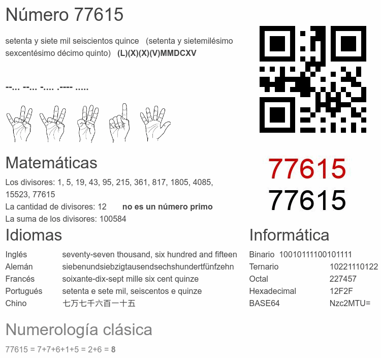 Si conoce algo interesante sobre el número 77615 o cualquier número natural (entero positivo), por favor escríbanos.Número 77 615 en otras unidades