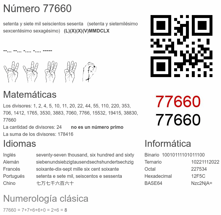Si conoce algo interesante sobre el número 77660 o cualquier número natural (entero positivo), por favor escríbanos.Número 77 660 en otras unidades