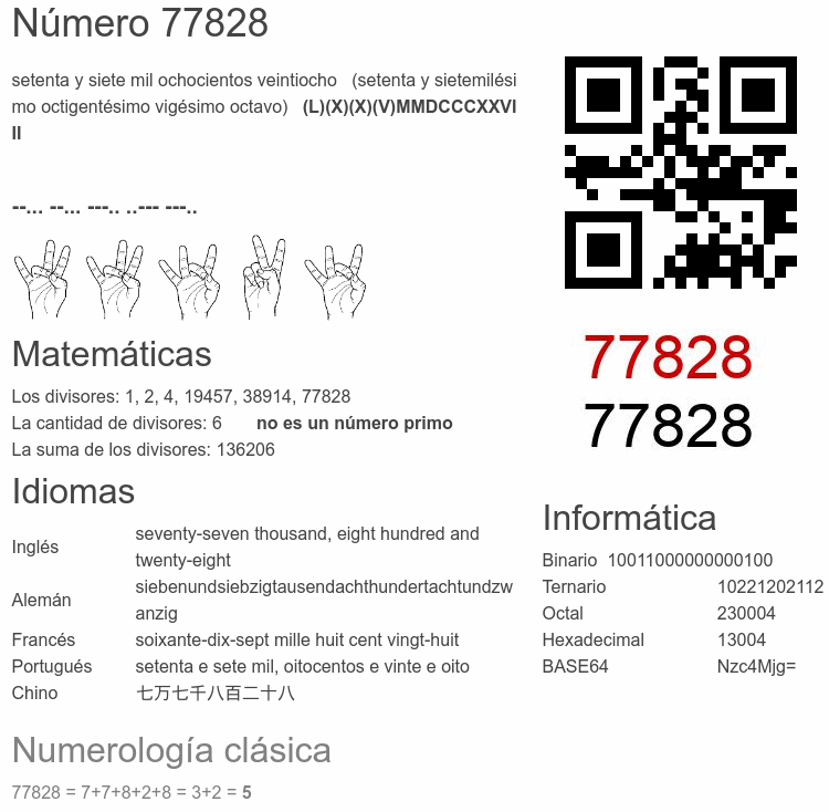 Si conoce algo interesante sobre el número 77828 o cualquier número natural (entero positivo), por favor escríbanos.Número 77 828 en otras unidades