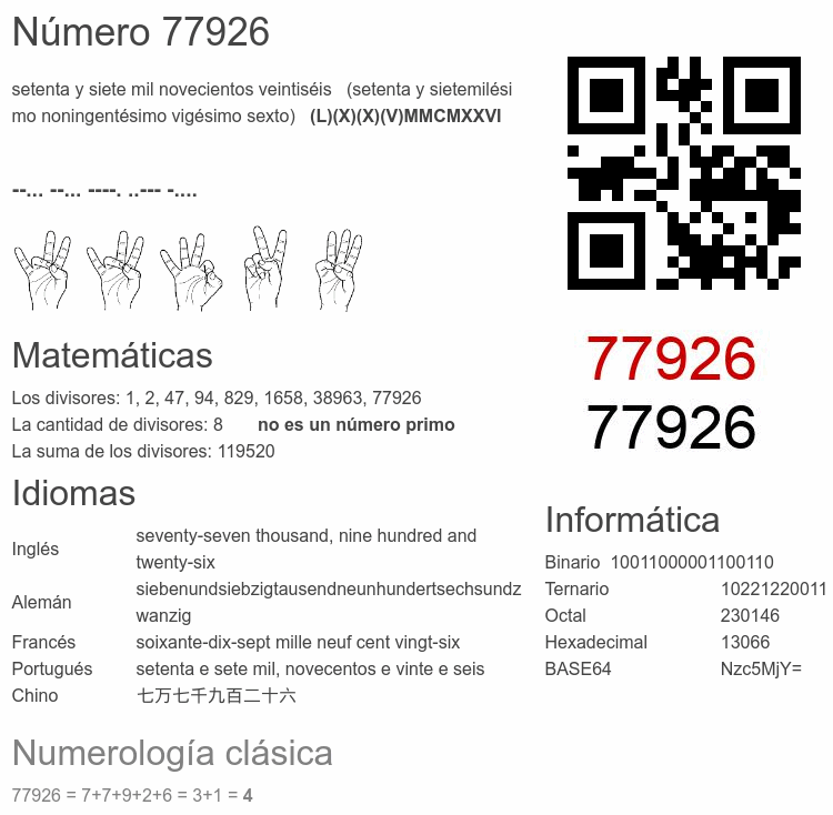Si conoce algo interesante sobre el número 77926 o cualquier número natural (entero positivo), por favor escríbanos.Número 77 926 en otras unidades