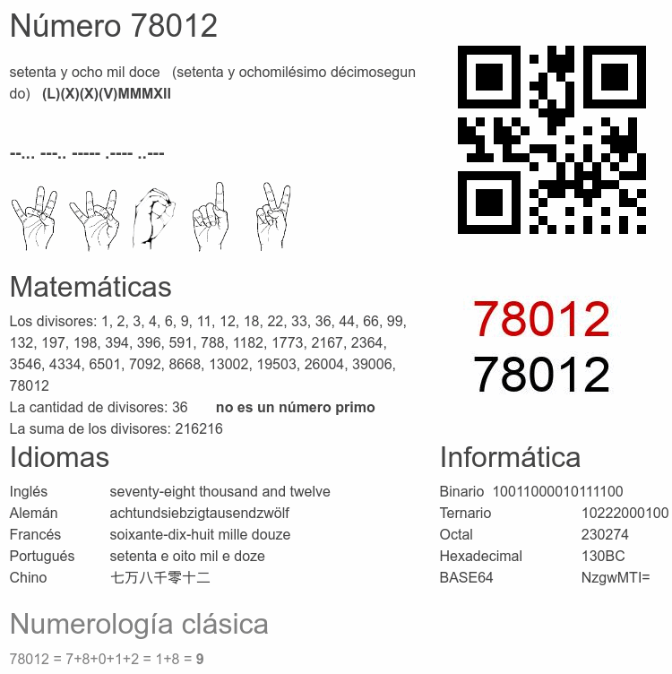 El número par 78 012 se dice 🔊, y se escribe con las palabras: setenta y ocho mil doce. El número ordinal 78012.° se dice 🔊 y se escribe como: setenta y ochomilésimo décimosegundo. El significado del número 78012 en Matemáticas: Es un primo? Factorización y árbol de factores primos. La raíz cuadrada de y la raíz cúbica de 78012. El significado en informática, numerología, códigos e imágenes, escritura y denominación en otras lenguas. Otras curiosidades relacionadas con el 78012.