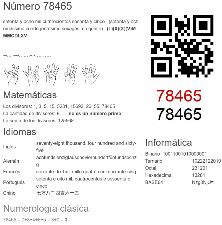 Si conoce algo interesante sobre el número 78465 o cualquier número natural (entero positivo), por favor escríbanos.Número 78 465 en otras unidades