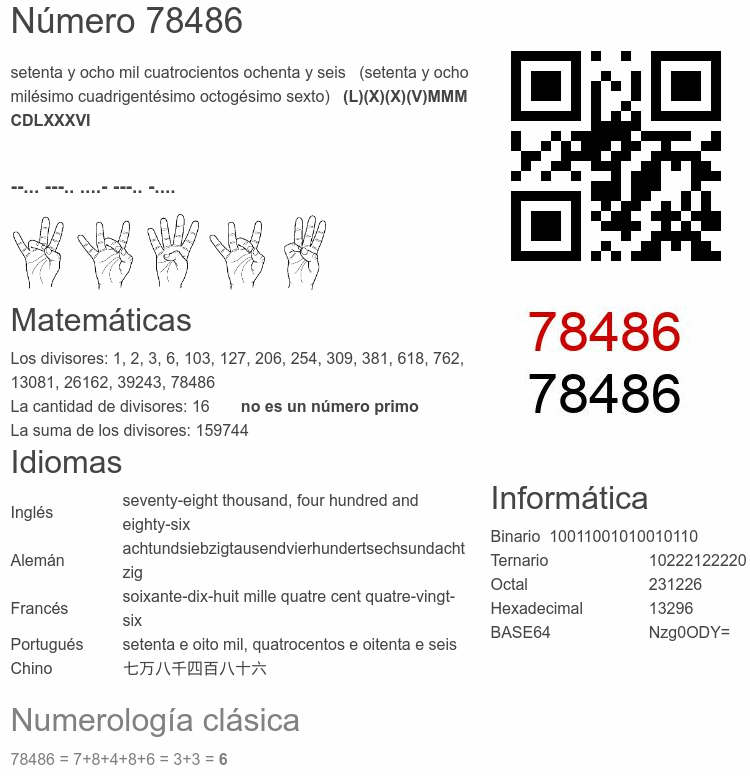 Si conoce algo interesante sobre el número 78486 o cualquier número natural (entero positivo), por favor escríbanos.Número 78 486 en otras unidades