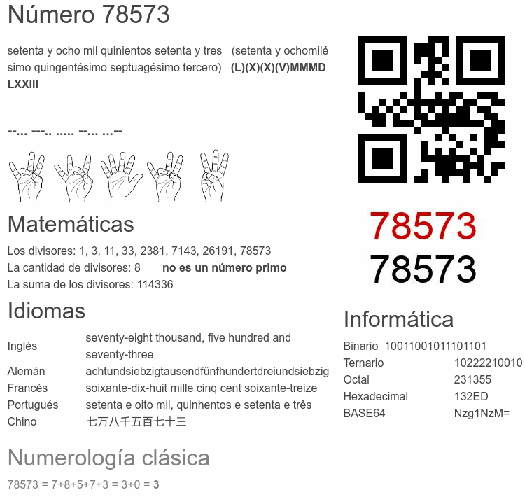 Si conoce algo interesante sobre el número 78573 o cualquier número natural (entero positivo), por favor escríbanos.Número 78 573 en otras unidades