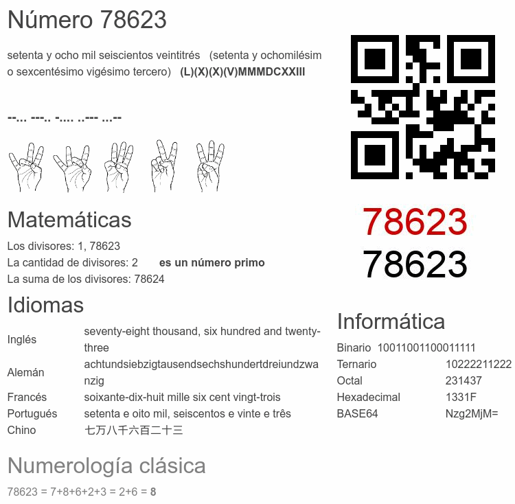 Si conoce algo interesante sobre el número 78623 o cualquier número natural (entero positivo), por favor escríbanos.Número 78 623 en otras unidades