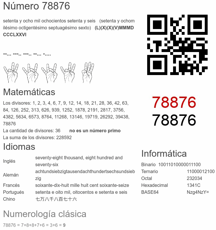 Si conoce algo interesante sobre el número 78876 o cualquier número natural (entero positivo), por favor escríbanos.Número 78 876 en otras unidades