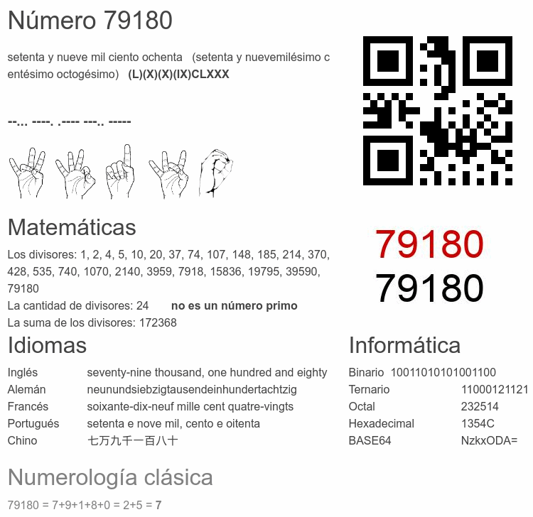 Si conoce algo interesante sobre el número 79180 o cualquier número natural (entero positivo), por favor escríbanos.Número 79 180 en otras unidades