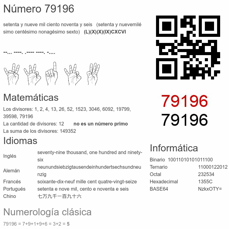 Si conoce algo interesante sobre el número 79196 o cualquier número natural (entero positivo), por favor escríbanos.Número 79 196 en otras unidades