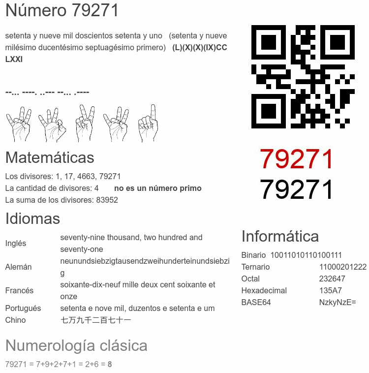 Si conoce algo interesante sobre el número 79271 o cualquier número natural (entero positivo), por favor escríbanos.Número 79 271 en otras unidades