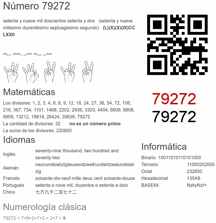 Si conoce algo interesante sobre el número 79272 o cualquier número natural (entero positivo), por favor escríbanos.Número 79 272 en otras unidades