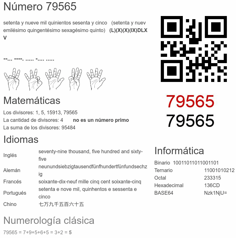 Si conoce algo interesante sobre el número 79565 o cualquier número natural (entero positivo), por favor escríbanos.Número 79 565 en otras unidades