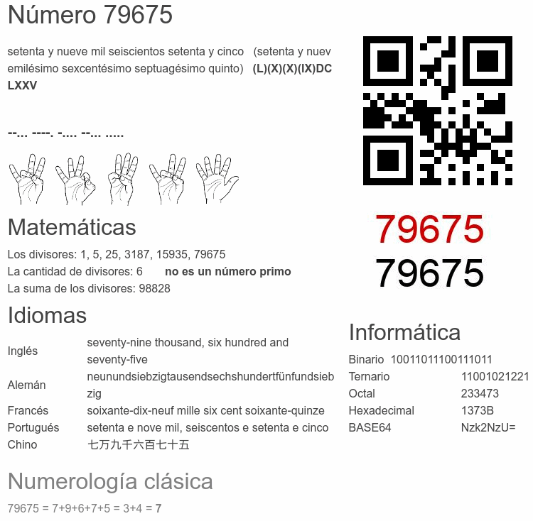 Si conoce algo interesante sobre el número 79675 o cualquier número natural (entero positivo), por favor escríbanos.Número 79 675 en otras unidades