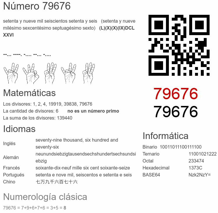Si conoce algo interesante sobre el número 79676 o cualquier número natural (entero positivo), por favor escríbanos.Número 79 676 en otras unidades