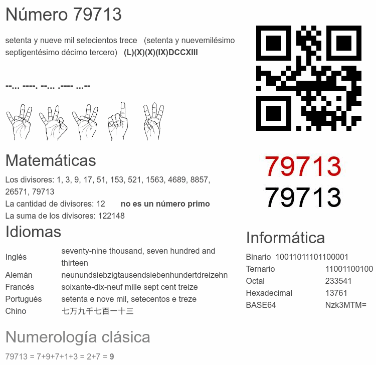 Si conoce algo interesante sobre el número 79713 o cualquier número natural (entero positivo), por favor escríbanos.Número 79 713 en otras unidades