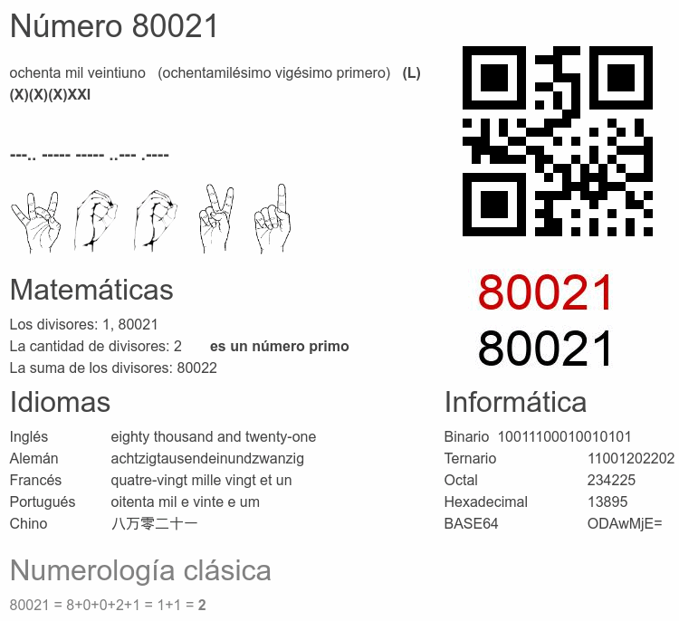 El número impar 80 021 se dice 🔊, y se escribe con las palabras: ochenta mil veintiuno. El número ordinal 80021.° se dice 🔊 y se escribe como: ochentamilésimo vigésimo primero. El significado del número 80021 en Matemáticas: Es un primo? Factorización y árbol de factores primos. La raíz cuadrada de y la raíz cúbica de 80021. El significado en informática, numerología, códigos e imágenes, escritura y denominación en otras lenguas. Otras curiosidades relacionadas con el 80021.