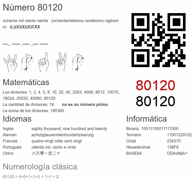 Si conoce algo interesante sobre el número 80120 o cualquier número natural (entero positivo), por favor escríbanos.Número 80 120 en otras unidades