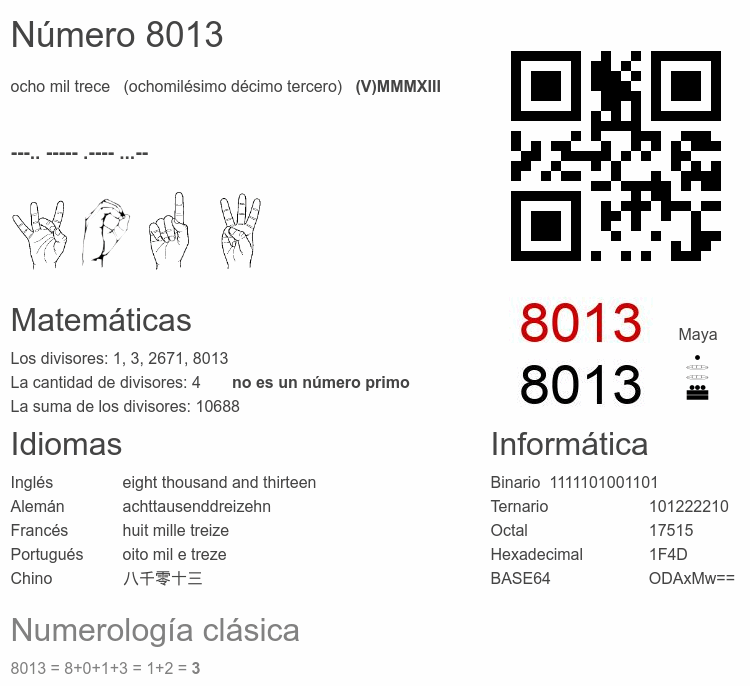 El número impar 8 013 se dice 🔊, y se escribe con las palabras: ocho mil trece. El número ordinal 8013.° se dice 🔊 y se escribe como: ochomilésimo décimo tercero. El significado del número 8013 en Matemáticas: Es un primo? Factorización y árbol de factores primos. La raíz cuadrada de y la raíz cúbica de 8013. El significado en informática, numerología, códigos e imágenes, escritura y denominación en otras lenguas. Otras curiosidades relacionadas con el 8013.