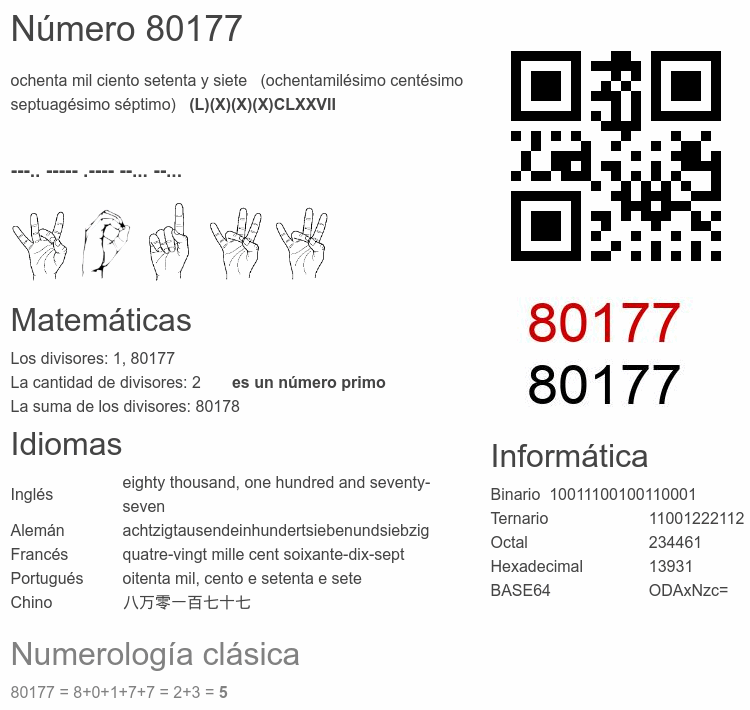 El número impar 80 177 se dice 🔊, y se escribe con las palabras: ochenta mil ciento setenta y siete. El número ordinal 80177.° se dice 🔊 y se escribe como: ochentamilésimo centésimo septuagésimo séptimo. El significado del número 80177 en Matemáticas: Es un primo? Factorización y árbol de factores primos. La raíz cuadrada de y la raíz cúbica de 80177. El significado en informática, numerología, códigos e imágenes, escritura y denominación en otras lenguas. Otras curiosidades relacionadas con el 80177.