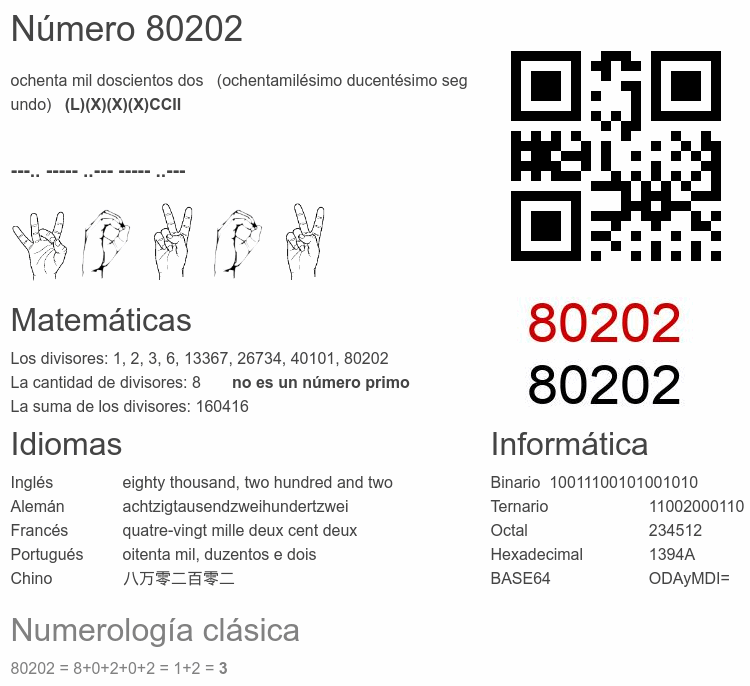 Si conoce algo interesante sobre el número 80202 o cualquier número natural (entero positivo), por favor escríbanos.Número 80 202 en otras unidades