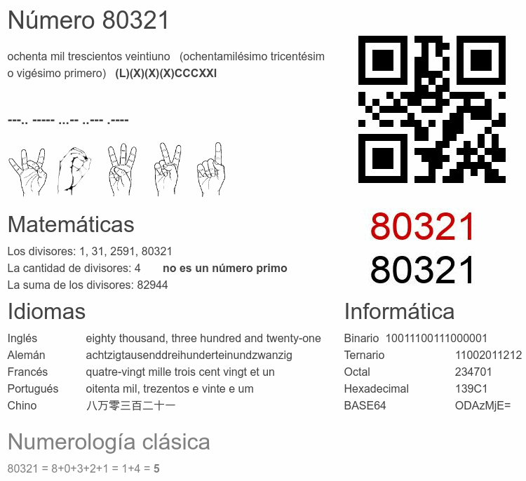 | Japonés: | 🔊 (数 80,321) | 八万三百二十一 |