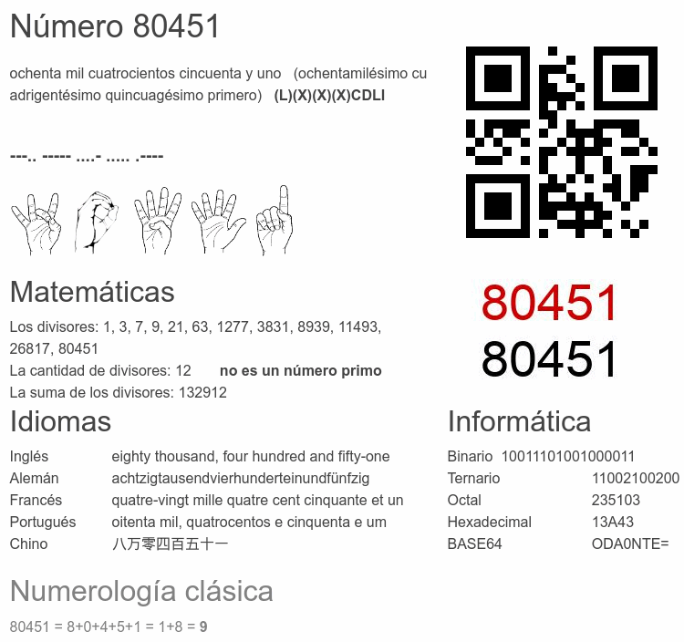 Si conoce algo interesante sobre el número 80451 o cualquier número natural (entero positivo), por favor escríbanos.Número 80 451 en otras unidades