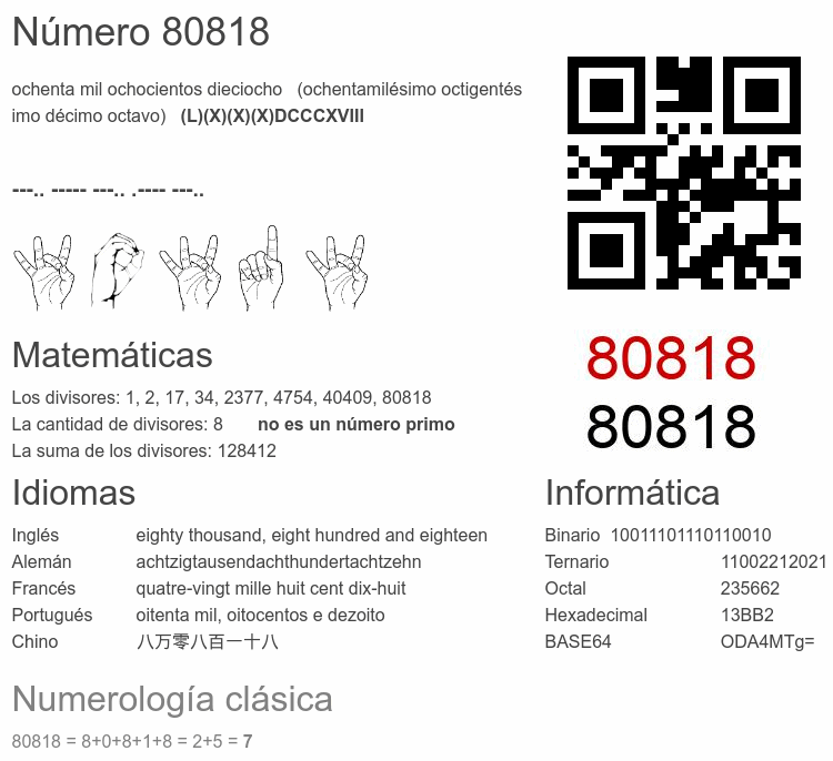 Si conoce algo interesante sobre el número 80818 o cualquier número natural (entero positivo), por favor escríbanos.Número 80 818 en otras unidades