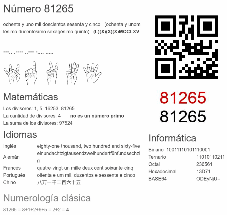 Si conoce algo interesante sobre el número 81265 o cualquier número natural (entero positivo), por favor escríbanos.Número 81 265 en otras unidades
