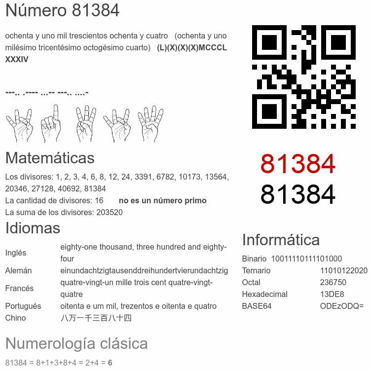 Si conoce algo interesante sobre el número 81384 o cualquier número natural (entero positivo), por favor escríbanos.Número 81 384 en otras unidades