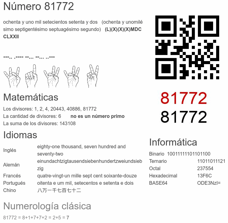 Número 81772 en el código morse: ---.. .---- --... --... ..---Lengua de Signos Española 81772: