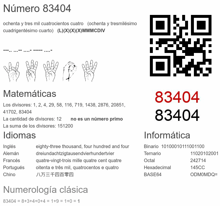 El número par 83 404 se dice 🔊, y se escribe con las palabras: ochenta y tres mil cuatrocientos cuatro. El número ordinal 83404.° se dice 🔊 y se escribe como: ochenta y tresmilésimo cuadrigentésimo cuarto. El significado del número 83404 en Matemáticas: Es un primo? Factorización y árbol de factores primos. La raíz cuadrada de y la raíz cúbica de 83404. El significado en informática, numerología, códigos e imágenes, escritura y denominación en otras lenguas. Otras curiosidades relacionadas con el 83404.