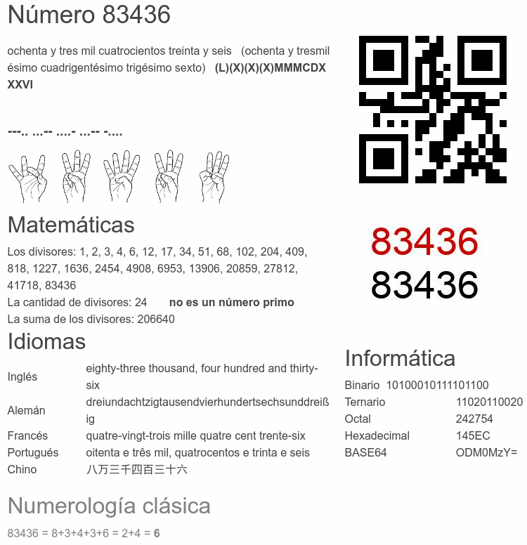El número par 83 436 se dice 🔊, y se escribe con las palabras: ochenta y tres mil cuatrocientos treinta y seis. El número ordinal 83436.° se dice 🔊 y se escribe como: ochenta y tresmilésimo cuadrigentésimo trigésimo sexto. El significado del número 83436 en Matemáticas: Es un primo? Factorización y árbol de factores primos. La raíz cuadrada de y la raíz cúbica de 83436. El significado en informática, numerología, códigos e imágenes, escritura y denominación en otras lenguas. Otras curiosidades relacionadas con el 83436.