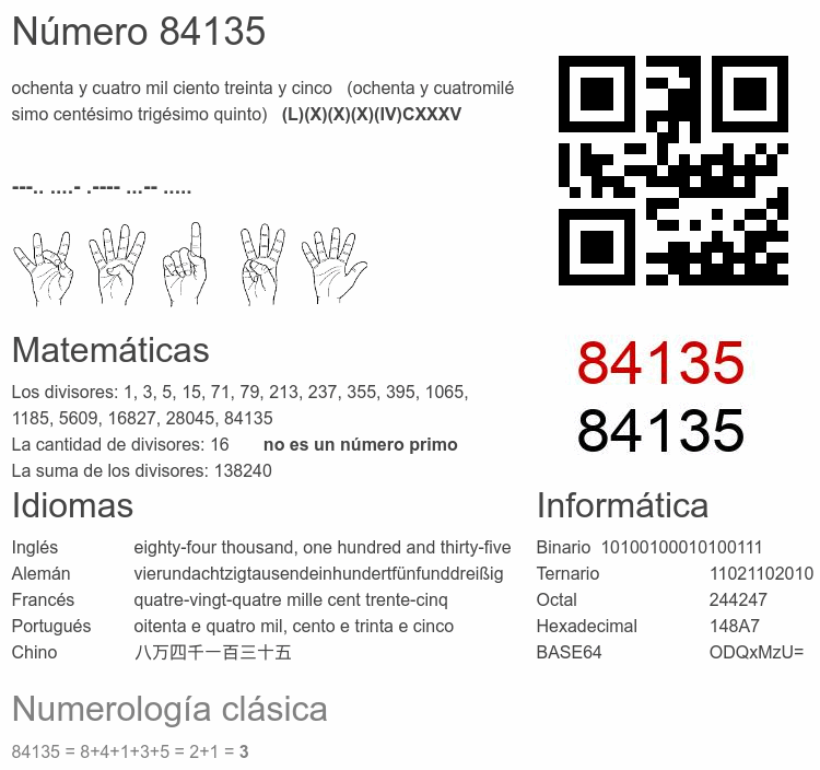 Si conoce algo interesante sobre el número 84135 o cualquier número natural (entero positivo), por favor escríbanos.Número 84 135 en otras unidades