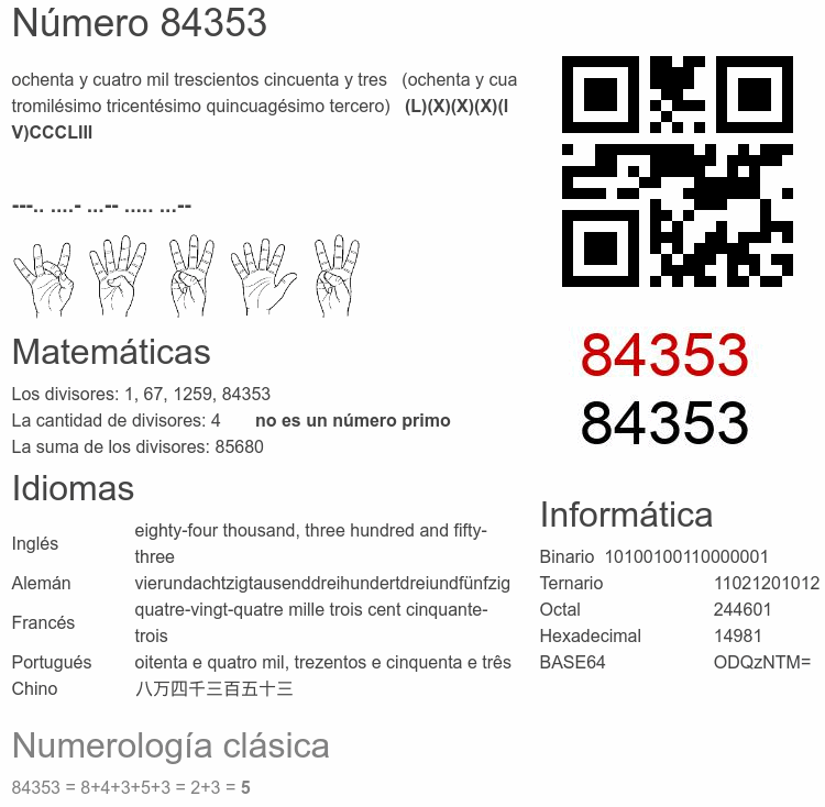 Si conoce algo interesante sobre el número 84353 o cualquier número natural (entero positivo), por favor escríbanos.Número 84 353 en otras unidades