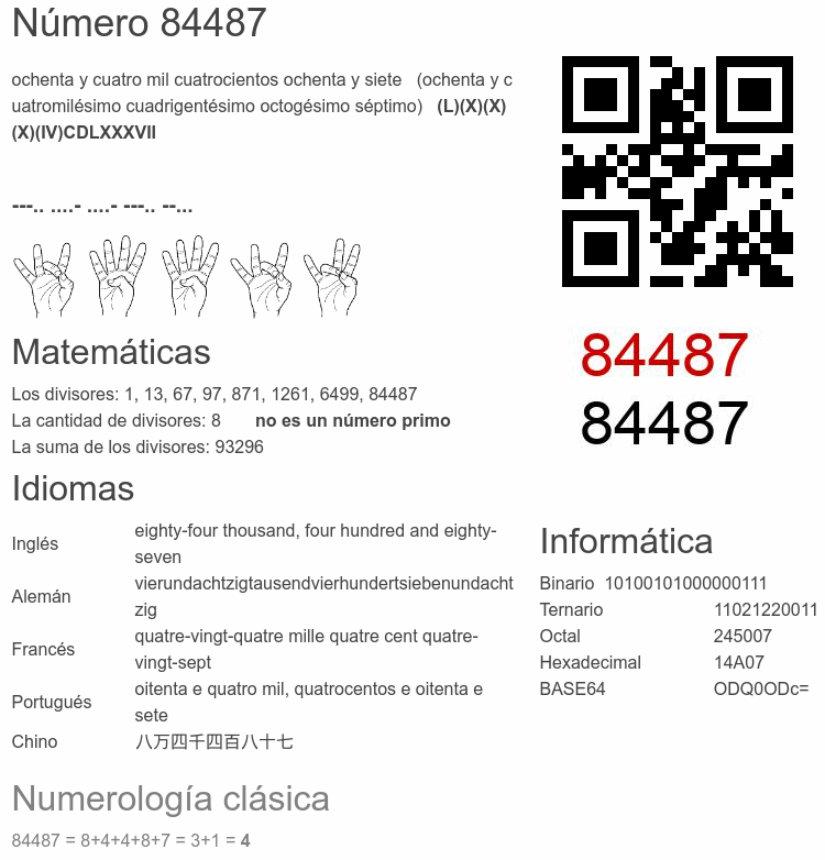 Si conoce algo interesante sobre el número 84487 o cualquier número natural (entero positivo), por favor escríbanos.Número 84 487 en otras unidades