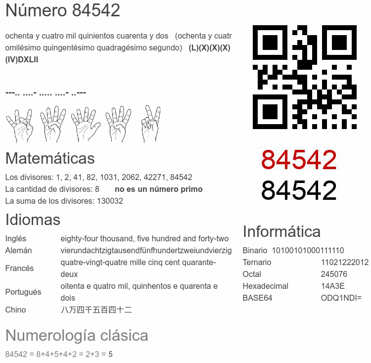 Si conoce algo interesante sobre el número 84542 o cualquier número natural (entero positivo), por favor escríbanos.Número 84 542 en otras unidades