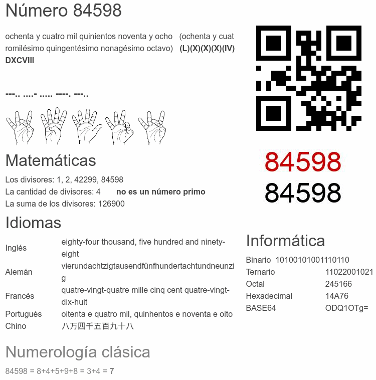 Si conoce algo interesante sobre el número 84598 o cualquier número natural (entero positivo), por favor escríbanos.Número 84 598 en otras unidades