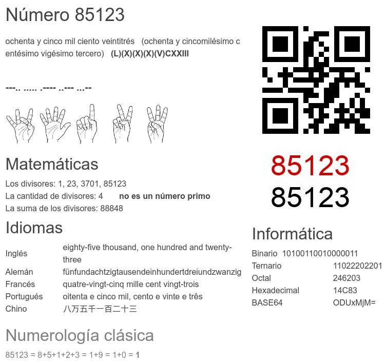 Si conoce algo interesante sobre el número 85123 o cualquier número natural (entero positivo), por favor escríbanos.Número 85 123 en otras unidades
