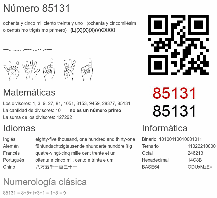 Si conoce algo interesante sobre el número 85131 o cualquier número natural (entero positivo), por favor escríbanos.Número 85 131 en otras unidades