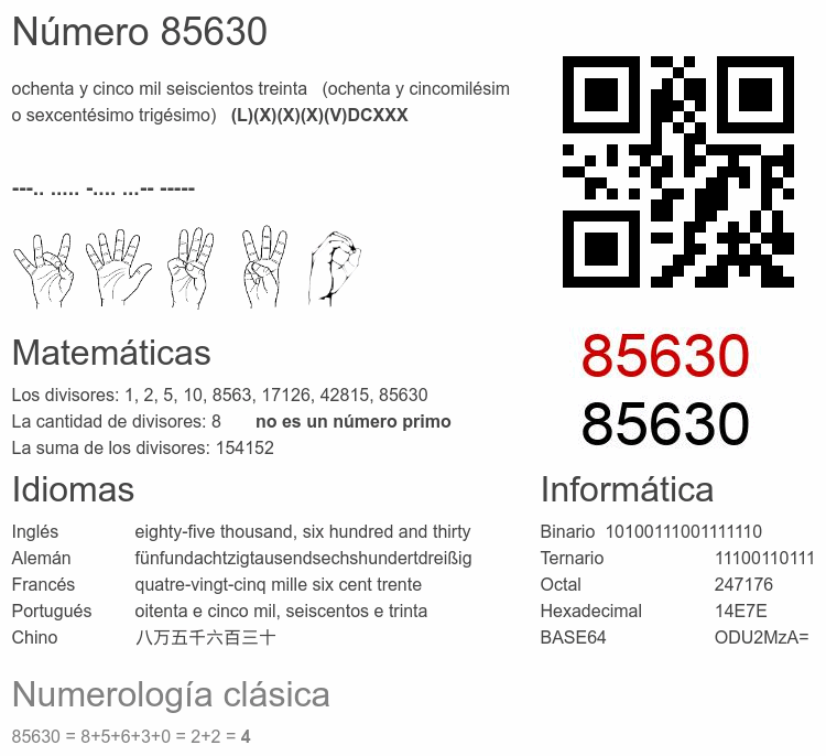 Si conoce algo interesante sobre el número 85630 o cualquier número natural (entero positivo), por favor escríbanos.Número 85 630 en otras unidades