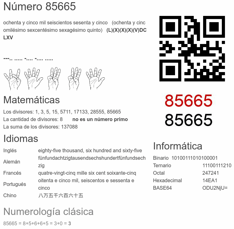Si conoce algo interesante sobre el número 85665 o cualquier número natural (entero positivo), por favor escríbanos.Número 85 665 en otras unidades