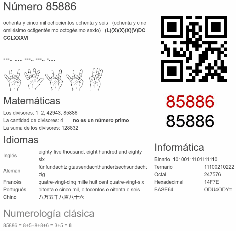 Si conoce algo interesante sobre el número 85886 o cualquier número natural (entero positivo), por favor escríbanos.Número 85 886 en otras unidades