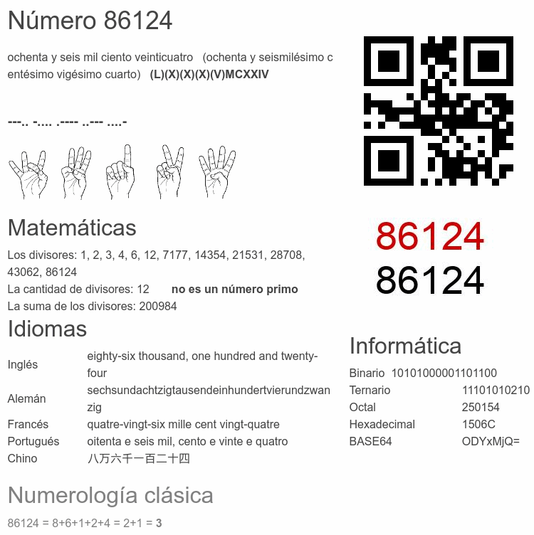 El número par 86 124 se dice 🔊, y se escribe con las palabras: ochenta y seis mil ciento veinticuatro. El número ordinal 86124.° se dice 🔊 y se escribe como: ochenta y seismilésimo centésimo vigésimo cuarto. El significado del número 86124 en Matemáticas: Es un primo? Factorización y árbol de factores primos. La raíz cuadrada de y la raíz cúbica de 86124. El significado en informática, numerología, códigos e imágenes, escritura y denominación en otras lenguas. Otras curiosidades relacionadas con el 86124.