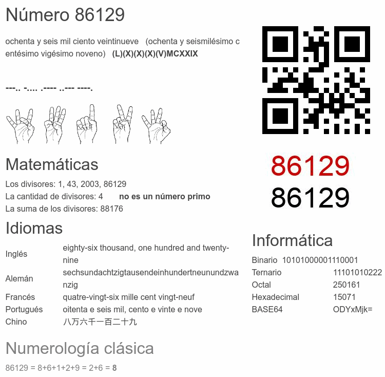 Si conoce algo interesante sobre el número 86129 o cualquier número natural (entero positivo), por favor escríbanos.Número 86 129 en otras unidades