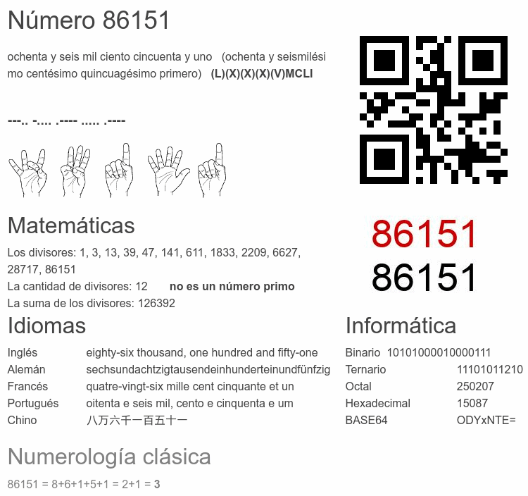 Si conoce algo interesante sobre el número 86151 o cualquier número natural (entero positivo), por favor escríbanos.Número 86 151 en otras unidades