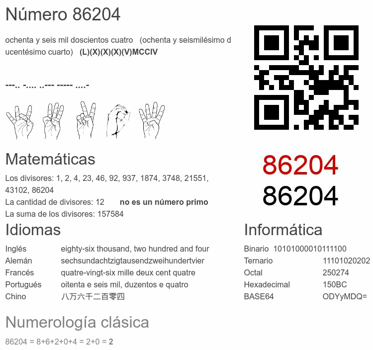 Si conoce algo interesante sobre el número 86204 o cualquier número natural (entero positivo), por favor escríbanos.Número 86 204 en otras unidades