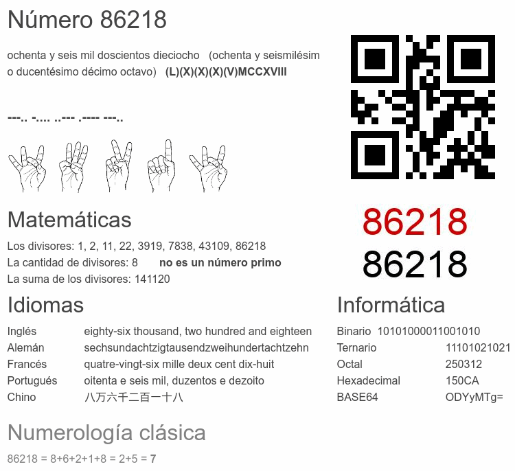 Si conoce algo interesante sobre el número 86218 o cualquier número natural (entero positivo), por favor escríbanos.Número 86 218 en otras unidades