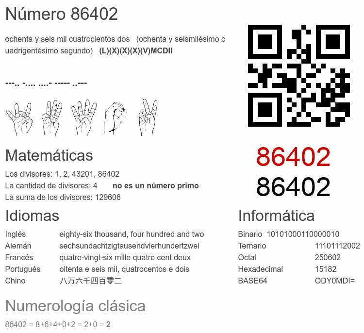 Si conoce algo interesante sobre el número 86402 o cualquier número natural (entero positivo), por favor escríbanos.Número 86 402 en otras unidades