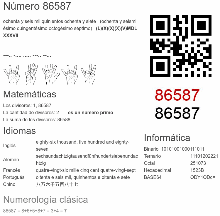 Si conoce algo interesante sobre el número 86587 o cualquier número natural (entero positivo), por favor escríbanos.Número 86 587 en otras unidades