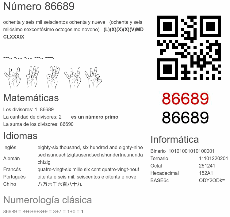 Si conoce algo interesante sobre el número 86689 o cualquier número natural (entero positivo), por favor escríbanos.Número 86 689 en otras unidades